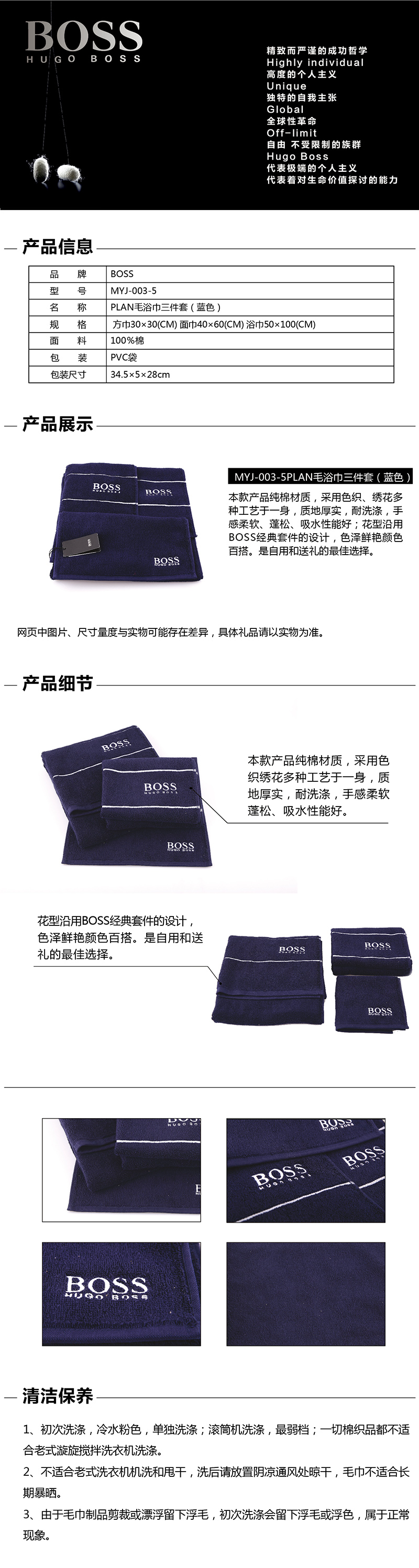 BOSS PLAN毛浴巾三件套(蓝色